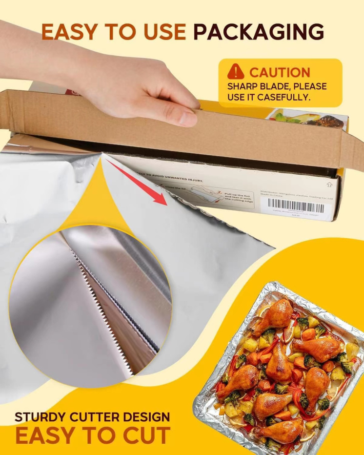 Easy Cutting Design - For convenience, the serrated cutter on the front of the heavy-duty aluminum foil packaging box allows for easy and precise cutting of the foil roll. Meanwhile, with fixators on both sides of the tinfoil roll, it stays in place during use and reduces hassle.